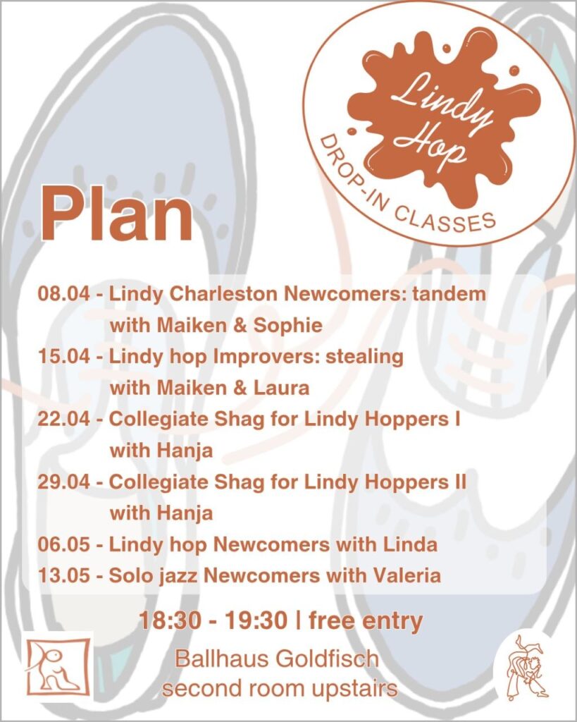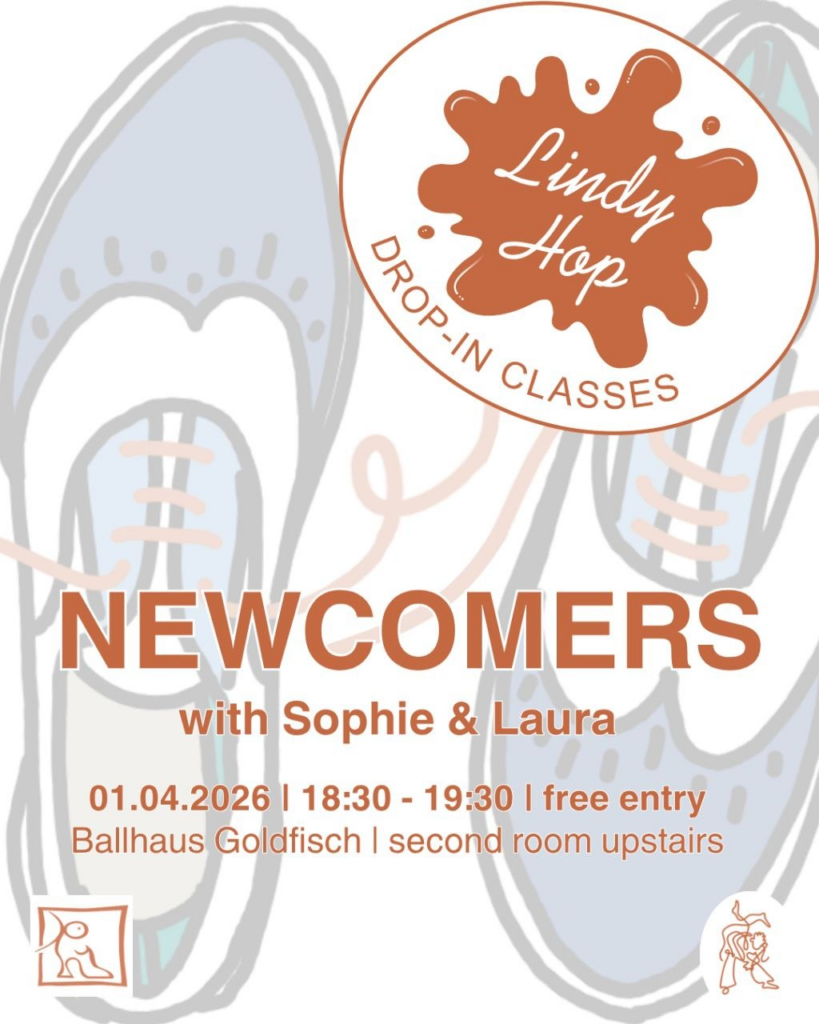 Von März bis Juli 2026 bieten wir mittwochs 18:30-19:30 Drop-in-Kurse zu wechselnden Themen im Ballhaus an (Lindyhop, solo jazz und mehr). Immer am ersten Mittwoch im Monat ist es ein Crashkurs/Schnupperkurs für Anfänger*innen, die den Grundschritt lernen wollen.