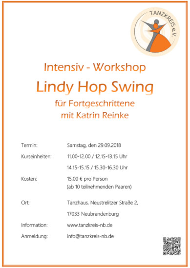 Wer gern seine Tanzfähigkeiten im Lindy Hop ausbauen möchte und bereits einen Anfängerkurs besucht hat (also die Basisfiguren drauf hat), kann dies bei einem Intensivworkshop Lindy Hop mit Katrin Reinke in Neubrandenburg umsetzten!